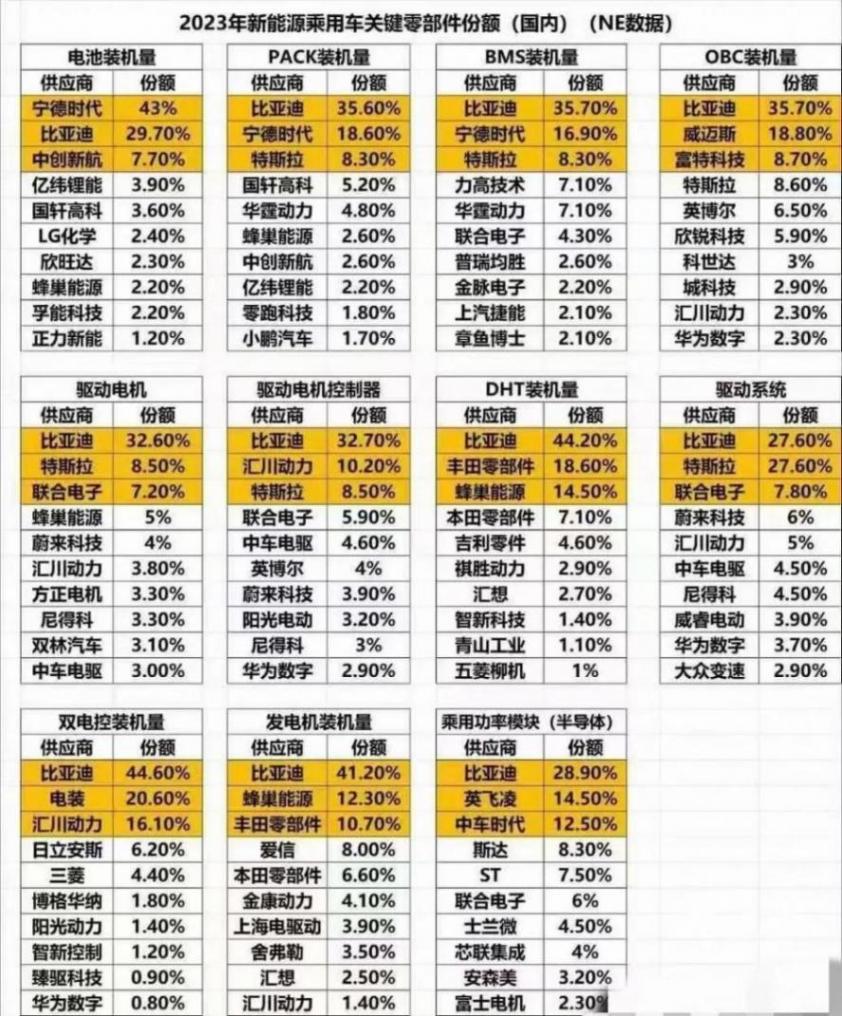 而除去五代dm-i这一筹码之外,在2024年一开年就掀起价格战的比亚迪,实际上还有非常多的“子弹”还未使用。根据相关统计数据显示,比亚迪在2023年(国内)新能源乘用车关键零部件领域的市场份额,已经达到了全面领先的水平。