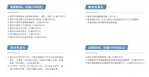 1、截止 2024 年 6 月 30 日,已购买或缴纳 10000 元定金锁单的客户,可享受一年内保价权益(自购车开票之日起,同等配置一年内降价,公司全额补差);