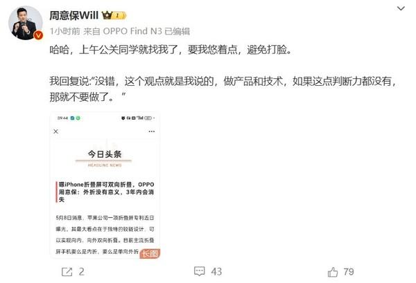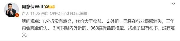近日,oppo find 系列产品负责人@周意保will 在微博上表示,外折没有意义,代价大于收益;而且外折折叠屏手机已经在行业慢慢消失,三年内会完全消失;可同时内外折的360度折叠屏手机也没有意义。他还表示,“没错,这个观点就是我说的,做产品和技术,如果这点判断力都没有,那就不要做了。”