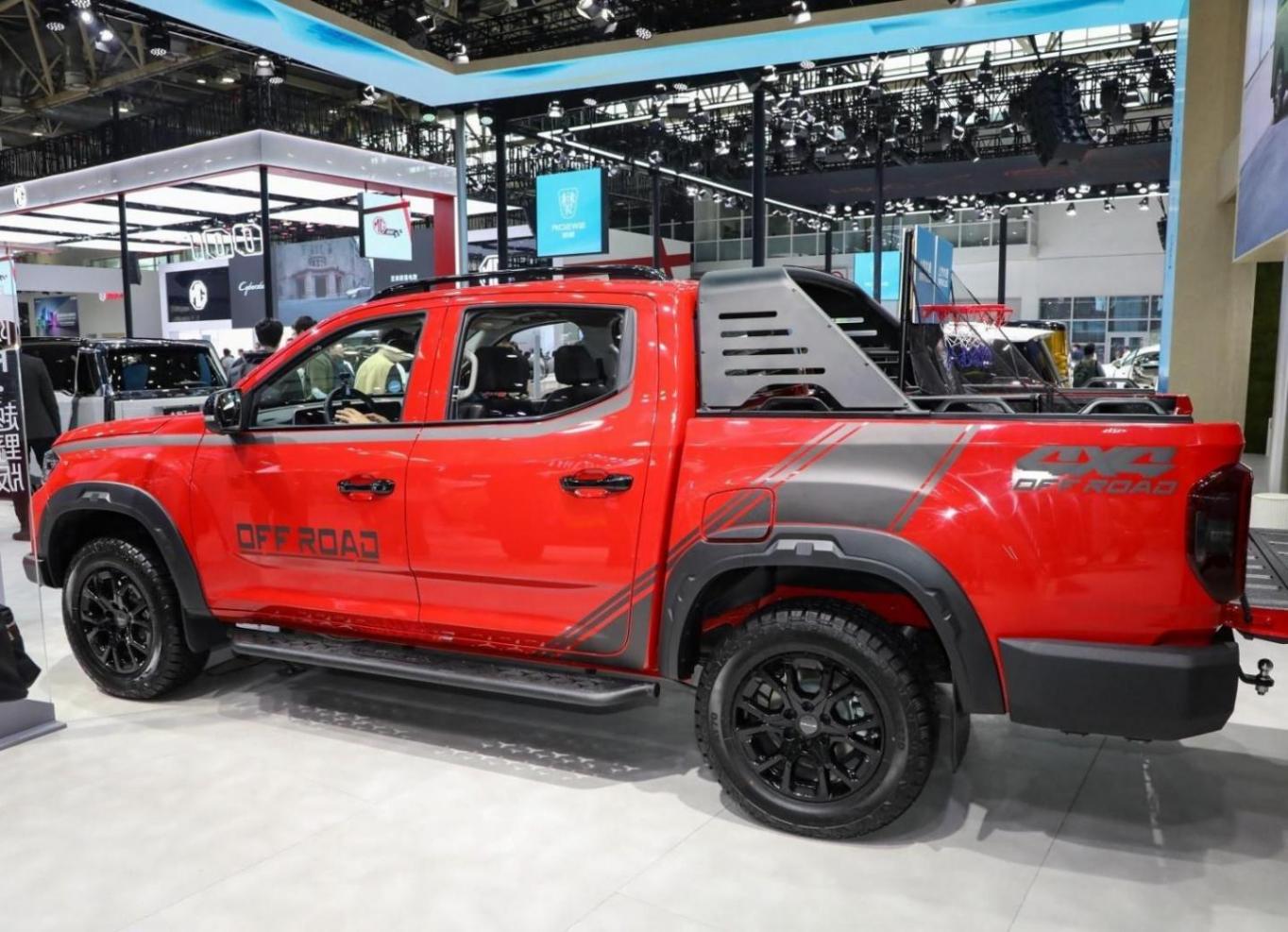 车身侧面部分的造型有着猛禽的既视感,车顶有着熏黑行李架来增加越野定位,而且车门部分还有着整体外扩的造型来提升厚重感,轮眉部分则是外扩式的造型设计,结合突出的熏黑饰板设计,让新车的越野氛围更加浓郁,后货箱部分的熏黑防滚架,以及多幅式的大尺寸熏黑轮毂,再结合宽厚的脚踏板,整体看起来很炫酷。车身尺寸方面,长宽高分别为5530(5845)/1960/1873毫米,轴距为3165(3480)毫米,标箱版货箱长宽高为1485/1510/530毫米,长箱版货箱长宽高为1800/1510/530毫米,大尺寸车身让新车看起来硬朗且霸气。