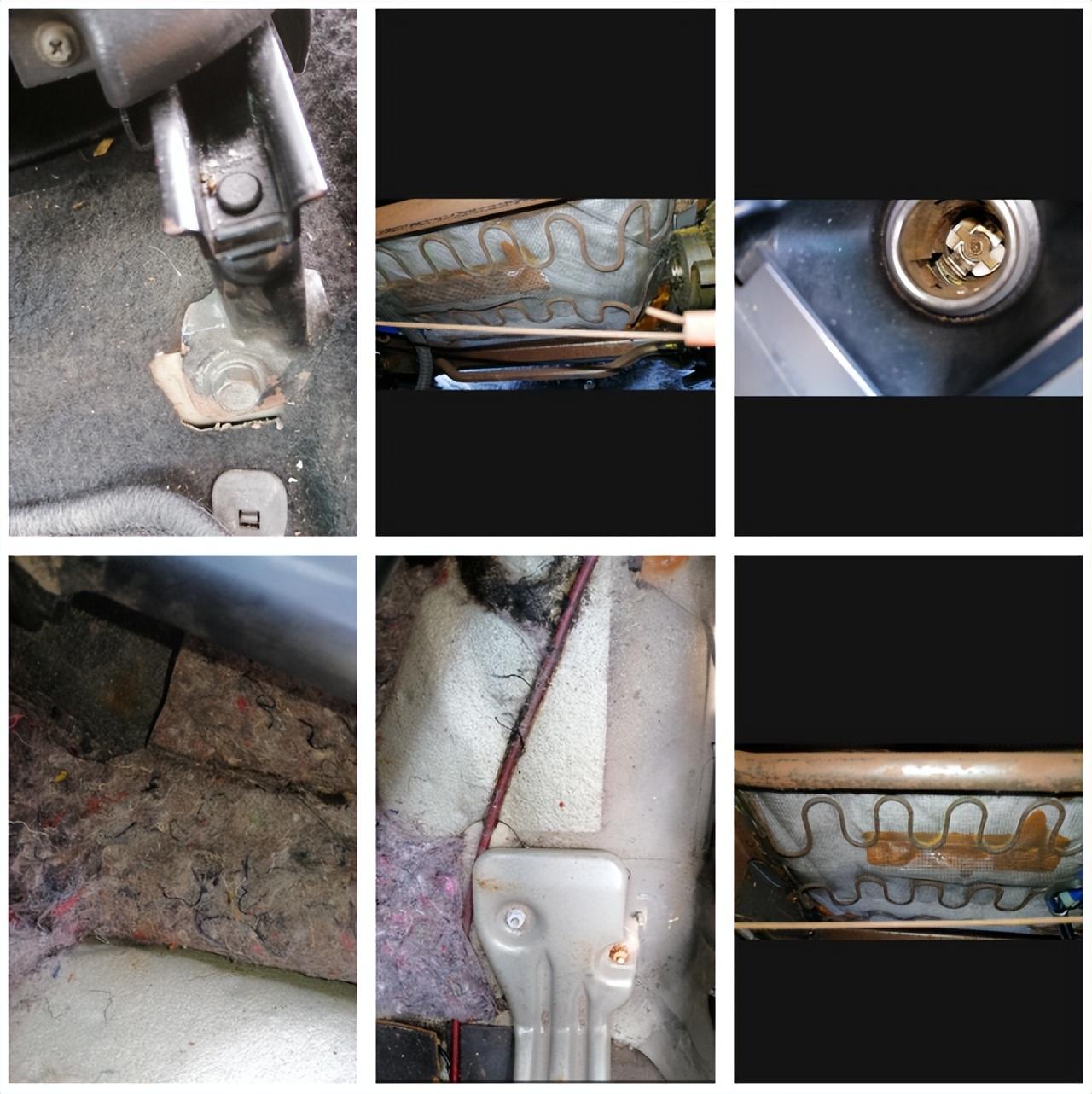 内饰检测存在正常的座椅老化破损,座椅骨架氧化生锈,地毯有年限长导致的浮土堆积,但是地毯及线束都是非常干净清爽的,因此可以排除水泡的情况。