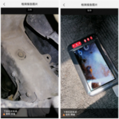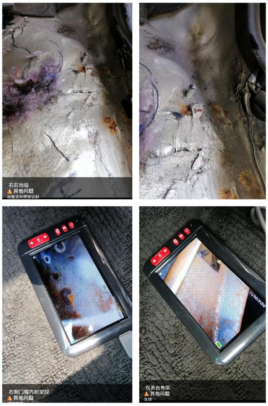 底盘整体的刮蹭托底也比较严重,最主要的还是右前位置有伤,可以看到下部右前纵梁变形,用内窥镜探查里面也有焊接。