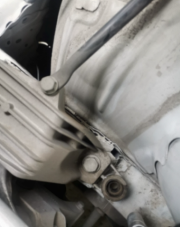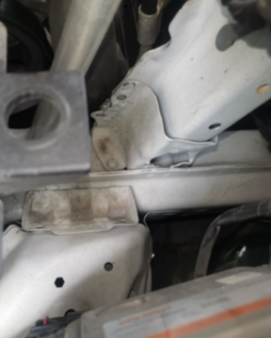 如上图所示,这个位置是发动机的机脚,纵梁跟减震包连接的位置简直跟狗啃的一样!后焊接的痕迹简直不要太明显了!这种情况大概率是切割更换了纵梁,因为只有这里有问题,纵梁前端竟然是没有变形。