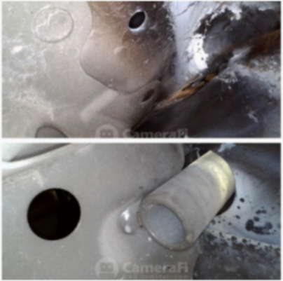 通过内窥镜从溃缩孔伸进去,焊接的痕迹不要太明显,都烧焦了!调整角度之后竟然还发现一根钢管!不过呢大家也不要太过差异,这都属于是老手段了,很多结构件的切割里面都会加一根钢筋或者钢管来增加强度,避免受到颠簸直接断掉!而这台车的切割点刚好就在发动机机脚的固定位置,试想一下,要是跑着跑着发动机突然掉了那不出大问题吗?