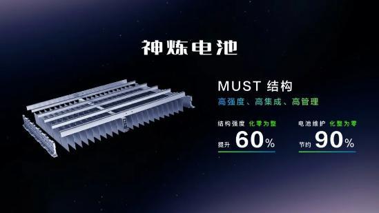 新车搭载“神炼电池”,首创不起火电芯“问顶技术”,不泄露、不起火、不爆炸;创新采用must结构,实现高集成、高强度、热管理等多功能合一,并通过车端 云端双bms智能协同全天候安全巡检。得益于电池包的创新结构设计,在极端情况下造成的电池包壳体和电芯损伤,神炼电池能实现单个电芯的维修和替换,为用户节约90%的维修成本。新车整车高强钢占比76.4%,结合前端铝合金防撞梁设计、三横三纵式热成型超高强钢结构底盘,形成高效安全的防护;同时配备esc电子车身稳定系统、auto hold自动驻车、360高清全景影像、定速巡航等辅助配置,为用户安全出行保驾护航。