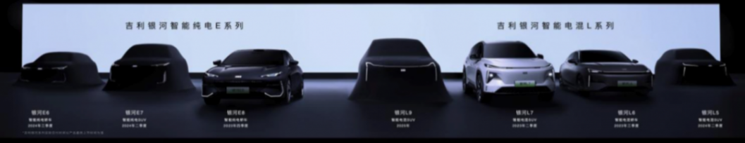 吉利银河品牌目前已发布三款车型,电混 suv 银河 l7、电混轿车银河 l6 与纯电轿车银河 e8。