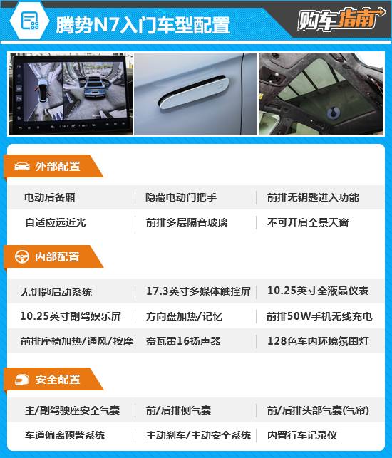 2024款腾势n7的入门车型配置表现非常丰富,不仅舒适性和便利性配置样样俱全,就连主/被动安全功能也直接拉满。而之所以此次没有推荐,主要原因在于续航里程,如果作为家里唯一的一辆车或者主力出行工具,亦或是家里没有条件安装充电桩,那么550km的纯电续航里程确实差点意思。