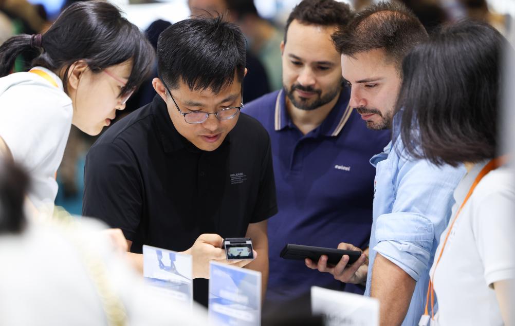 4月17日,观众在第四届消博会上的科大讯飞展台参观了解讯飞翻译机。新华社记者杨冠宇 摄