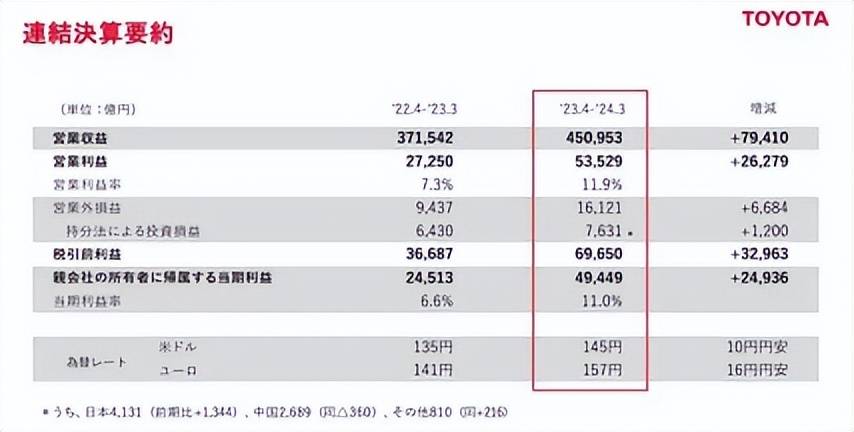 2023年,丰田全球销量达到了1049万辆,稳坐全球销量冠军宝座,排在其后的则是大众、以及如日中天的特斯拉等强劲对手。而在中国市场,丰田2023年销量接近180万辆,同样稳居外资品牌前列。2023财年,丰田的净利润为约 2.8万亿日元(约合 200亿美元),这个数字在全球汽车行业都是领先的。