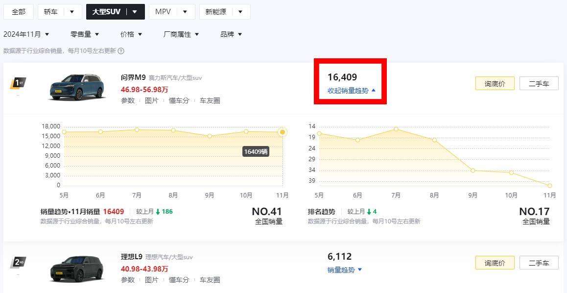 而问界m9则更厉害了,11月份一口气狂甩出去了16409辆新车,远超排在它身后的理想l9超1万辆新车之多,也一举夺得了大型suv市场里销量冠军的宝座。