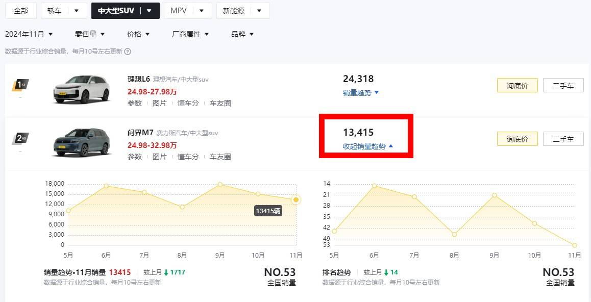 问界自从凭借m7和m9这两款车型大火了之后,便开始了一路“过关斩将”的历程。从最新的11月份销量榜单来看,问界m7取得了13415辆新车的月度成绩单,排在中大型suv销量榜第二名。