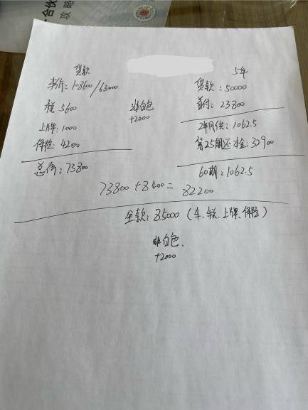 首付2.38万元,剩下5万元安排5年贷款,月供1062.5元,整整2年内不能提前归还,2年后即25期可还剩余的全部本金。