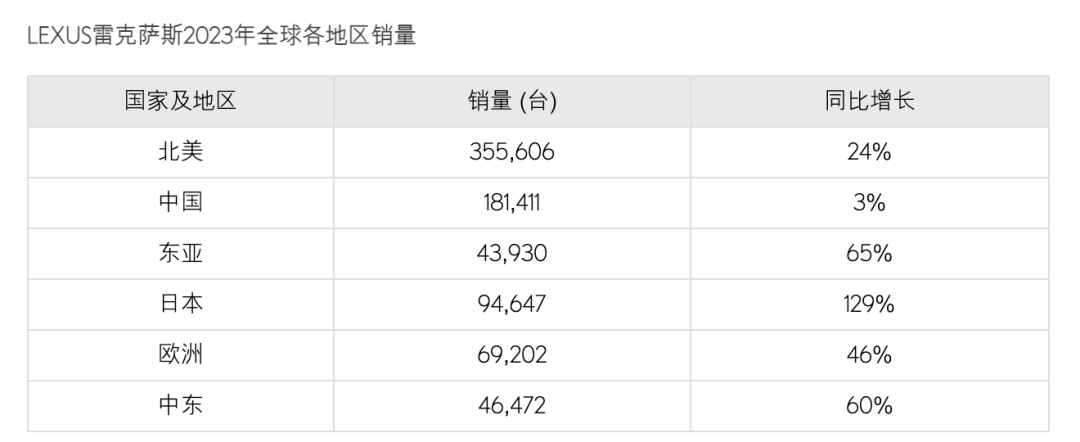 2023年,雷克萨斯在华销量约18.14万辆,同比增长仅3%。与之对比的是2023年,雷克萨斯在中国以外的全球其他市场均迎来了20%以上的增长。其中,中东、日本和东亚等地区的同比增速超过60%,甚至达到130%。