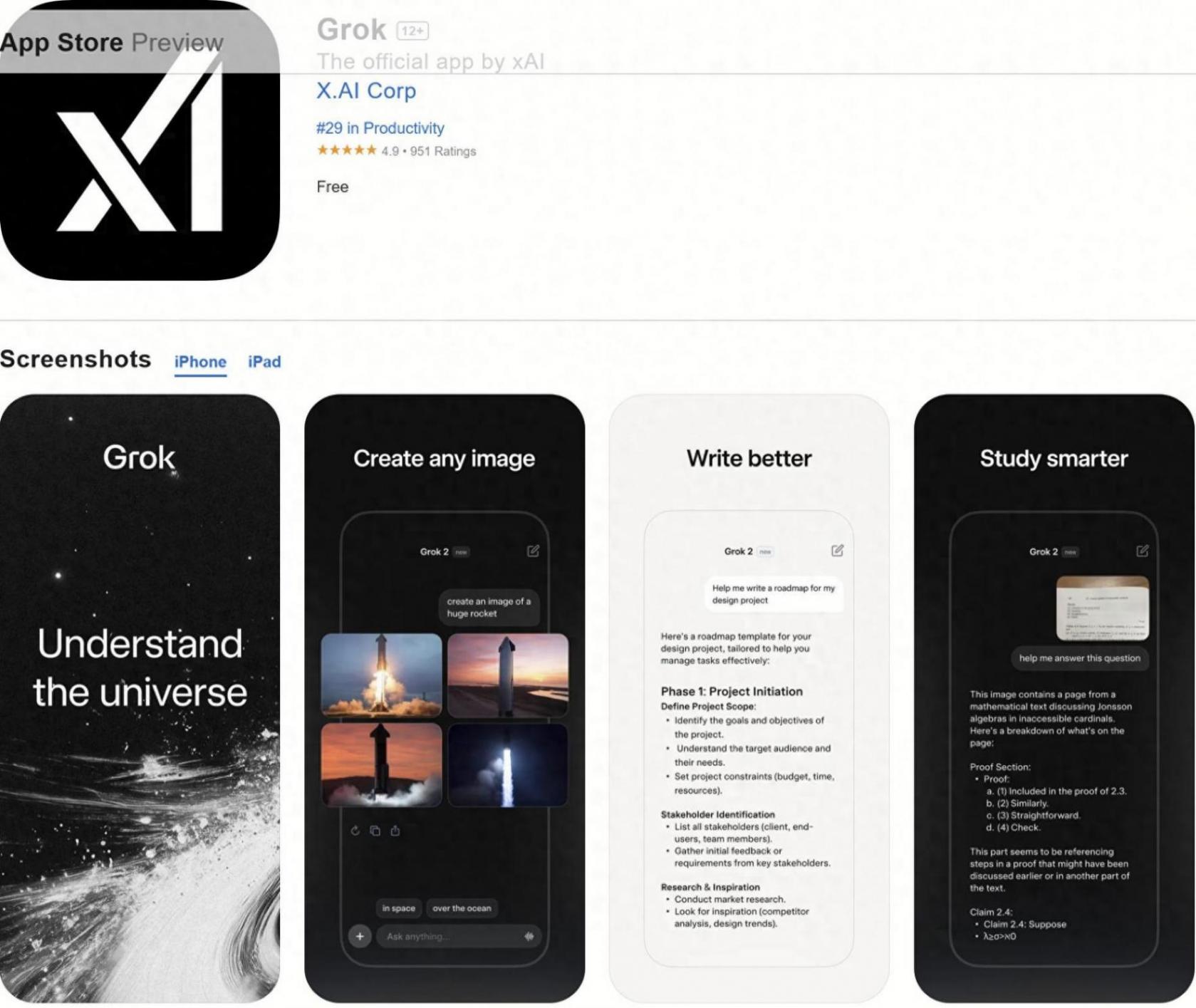 埃隆-马斯克(elon musk)的人工智能公司 xai 正在为其聊天机器人 grok 测试一款独立的 ios 应用程序。该应用目前已在美国、澳大利亚和印度等多个国家上线,可以访问来自网络和 x 的实时数据,并提供改写文本、总结长段落、小问答等生成式 ai 功能,还能根据文本提示生成图片。