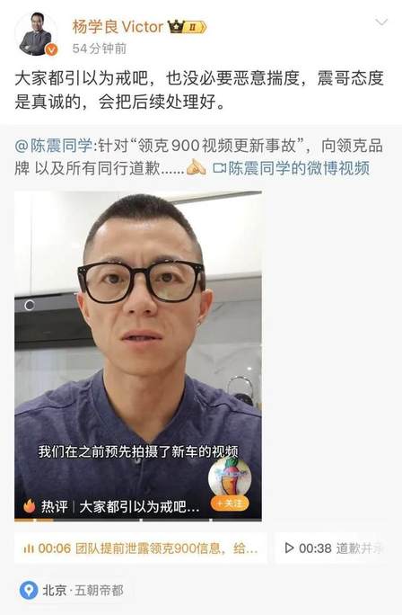 陈震在社交媒体平台上发布道歉视频