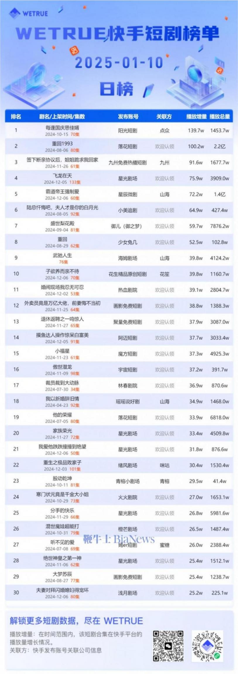 1月11日消息,为帮助短剧从业者提供更多信息,专注于短剧报道的新腕儿和科技媒体鞭牛士联合wetrue短剧热度榜共同推出多种短剧热度榜。
