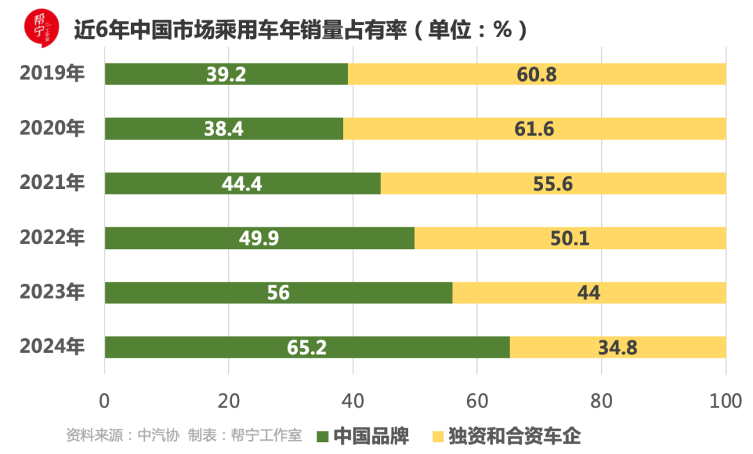 不过,近年来国内市场风云变幻,中国品牌乘用车销量一路高歌猛进,2024年占比攀升至65.2%,而合资板块的市场份额则大幅缩水,退守至35%左右,其中韩系车尤其艰难,占比仅为1.6%。