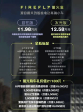 值得注意的是,萤火虫的起售价相较于14.88万元起的预售价直降2.9万元,相当于打了8折,新车将于4月29日开启交付。而萤火虫的baas方案,将于8月1日推出。