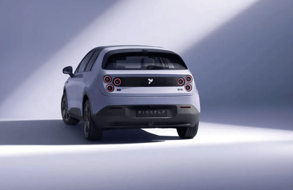 新车前脸采用封闭式设计,前大灯组由三个圆形光环组成,车灯点亮后极具辨识度。车头正中央是firefly萤火虫的品牌标识,该品牌标识由两部分组成,共同组成了“y”字母,对应萤火虫的首字母。