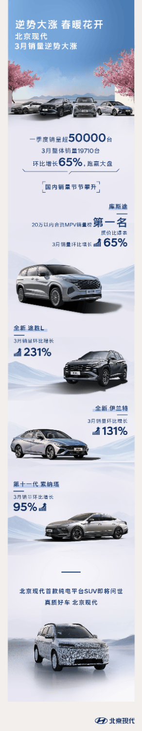 而这种回归,有一个合资车企理所当然的接盘了,那就是北京现代。小编并非刻意为它贴金,一切以数据为证:它在一季度的销量超过了50000台,跑赢合资车“集体反攻”大盘。仅3月销量就达到19710台,环比增长65%。具体来看,3月环比增长65%,位列20万以内合资mpv销量榜第一;全新3月销量环比增长达131%;第十一代索纳塔3月销量环比增长95%;全新途胜l3月销量环比增长更是高达231%。如此亮相的业绩,无疑成为合资车集体反攻的“孤证”,同时也引发友商们的反思:它到底做了什么?