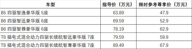 全新xc90共推出5款车型,售价分别为:b5四驱智逸豪华版5座售价63.89万元,b6四驱智远豪华版6座售价69.59万元,b6四驱智雅豪华版6座售价78.19万元,t8插电式混合动力四驱长续航智远豪华版7座售价79.59万元,t8插电式混合动力四驱长续航智尊豪华版7座售价89.49万元。2025年4月15日-30日购车,可享受限时参考尊享价47.9万元-67.9万元。