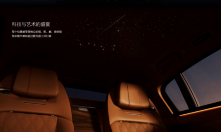 传统超豪华车的座舱强调用料奢华和手工打造,比如劳斯莱斯标志性的星空顶,通过手工植入上千根光纤来模拟星光散射的效果。而在尊界s800上,智能星空顶的满天繁星似乎还能展现出流动的效果,这便是创新科技带来的革新体验。