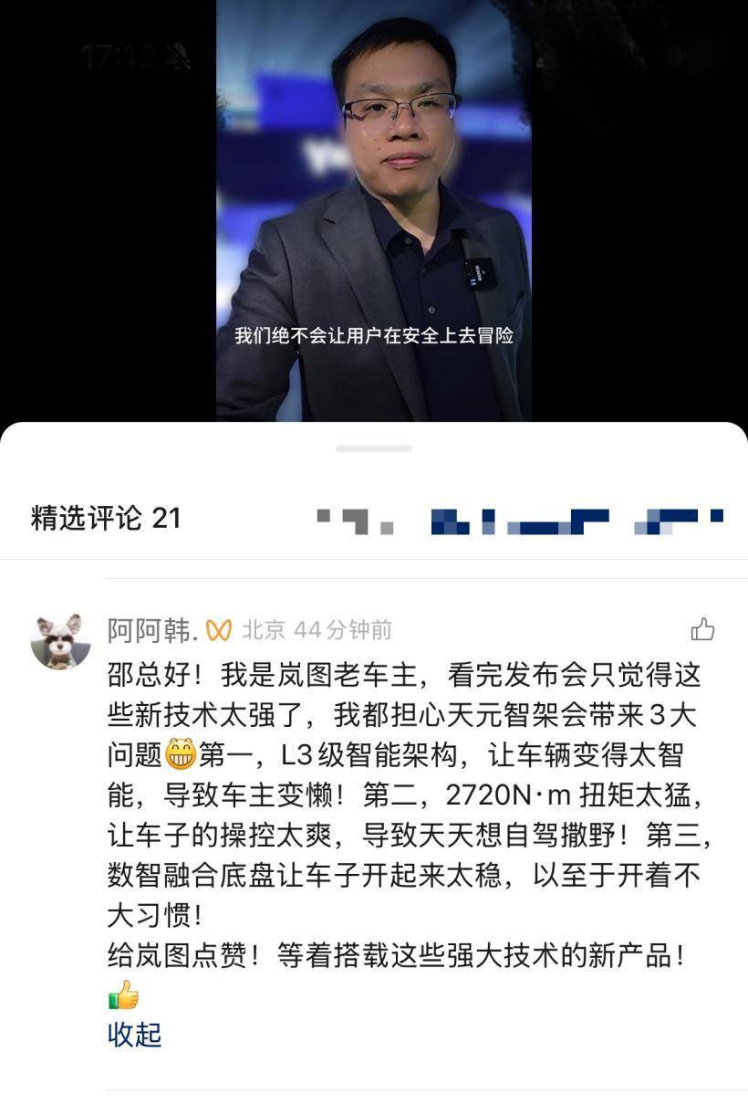 针对车主关切,岚图高管亲自下场回应。岚图汽车cbo邵明峰通过社交平台,感谢网友对岚图新技术的支持,同时也呼吁用户朋友们,“安全是驾驶的前提,无论驾驶辅助技术如何先进,也要注意行车安全。”。l3架构通过超700线激光雷达、超1000tops算力芯片等配置,让“安全冗余”成为每辆岚图的标配。例如,该架构可在100米外识别15cm小物体,aeb刹停速度高达160km/h,为车主提供极致安全保障。
