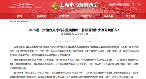 为了促进销量,推动中国汽车市场发展,上海市在以旧换新政策上再度发力,将置换更新补贴范围扩大至外牌旧车。2025年1月1日至12月31日,购买10万元及以上新能源新车补贴1.5万元,购买10万元及以上燃油车新车补贴1.3万元。