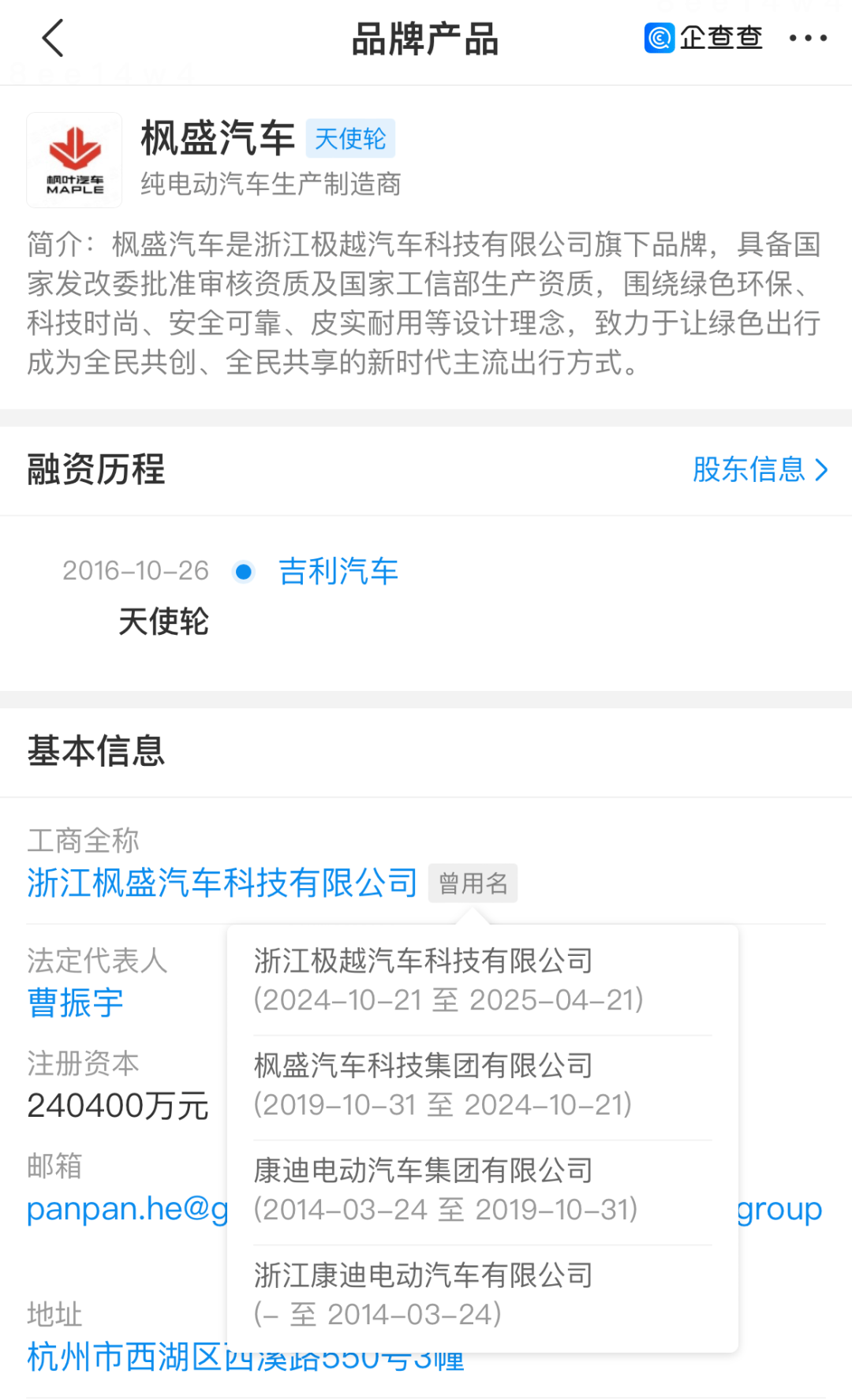 企查查的公开信息显示,浙江极越汽车科技有限公司目前已变更名称为浙江枫盛汽车科技有限公司——2024年10月,其才从“枫盛”更名为“极越”,这家公司具备国家发改委批准审核资质及国家工信部生产资质。在更名的同时,该公司新增股东台州吉利汽车工业有限公司,持股比例为0.01%,此次更名背后的意义耐人寻味,同时也让极越汽车再次引发关注。