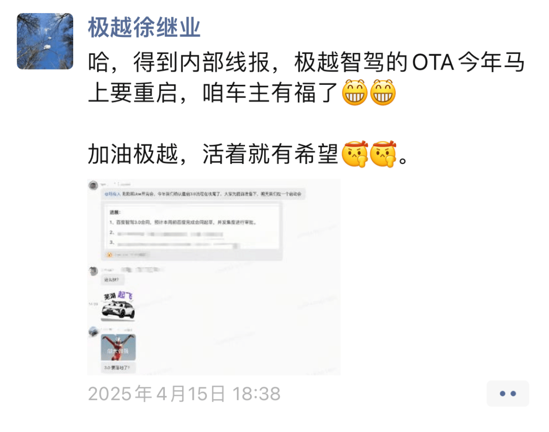 在纪录片播出的前一天,极越公关负责人徐继业在朋友圈表示,极越智驾的ota今年要重启。从他发出的图片来看,应该是极越的内部沟通群信息,上面的进展显示,预计百度将完成智驾3.0的合同起草,并发集度进行审批。