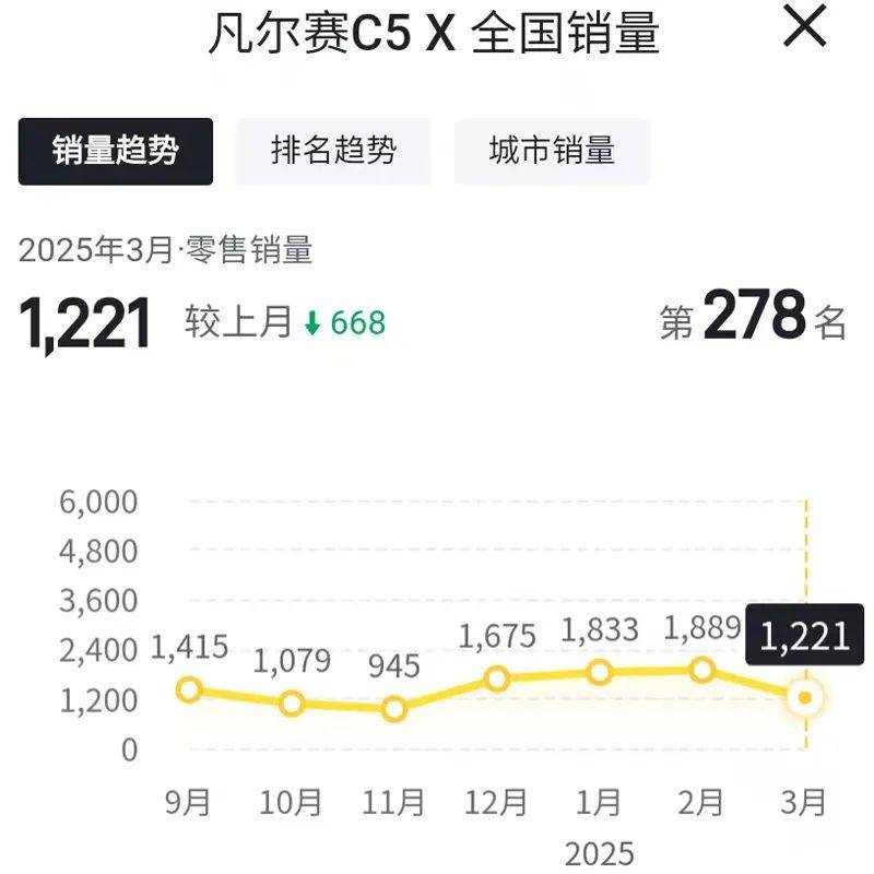 具体车型方面,2025年3月份,的销量为1221辆,与今年2月份的销量1889辆相比,环比下滑35.36%。而从单月销量表现来看,今年前3个月,雪铁龙凡尔赛c5 x的销量几乎都在1千辆以上,2000辆以下。