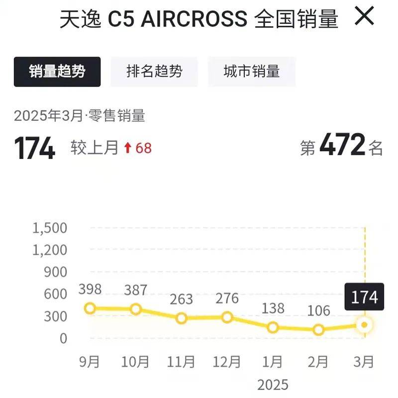 另一款车型,雪铁龙天逸c5 aircross在今年3月份的销量为174辆,相比今年2月份的销量106辆,增长68辆,但是由于雪铁龙天逸c5 aircross本身的销量基数并不大,所以雪铁龙天逸c5 aircross单月的增长,并没有影响雪铁龙整体的销量表现。