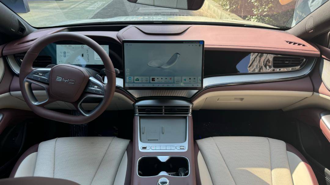 进入车内,新款海豹07dm-i简约风格的内饰让人眼前一亮。中控台覆盖大面积软性材质,搭配全液晶仪表 15.6英寸悬浮式中控屏,营造出不错的科技氛围。同时,新车还采用电子怀挡杆,不仅换挡操作更方便,还为中控区域释放了更多的储物空间,而且部分车型还增加了冷暖冰箱。