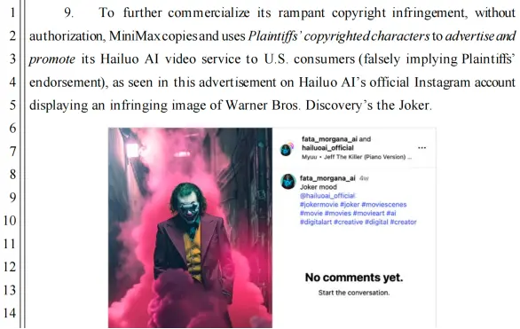 其举例称,“hailuo ai官方instagram账号”曾“展示一张侵犯j9com的版权的华纳兄弟探索公司(warner bros. discovery)旗下小丑(joker)角色的图像。”