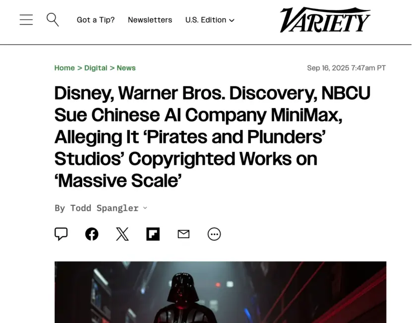 据路透社、彭博社等多家媒体报道,当地时间9月16日周二,三家娱乐公司——迪士尼、康卡斯特旗下环球影业、华纳兄弟探索——联手起诉minimax,指控其侵犯知识产权,案件已由加州中区法院受理。