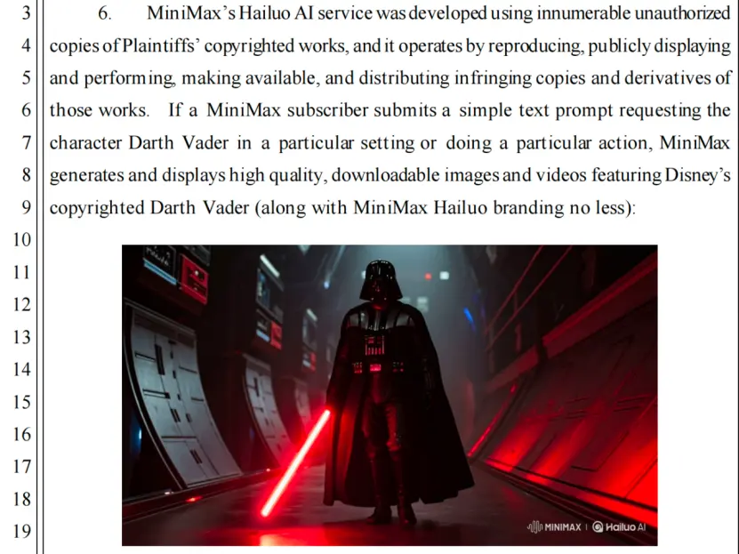 比如,起诉书中称:“如果minimax订阅用户提交一个简单的文本提示,请求角色达斯·维达在特定场景中或执行特定动作,minimax就会生成并显示高质量的可下载图片和视频,其中包含迪士尼受j9com的版权保护的达斯·维达(以及minimax hailuo品牌)。”