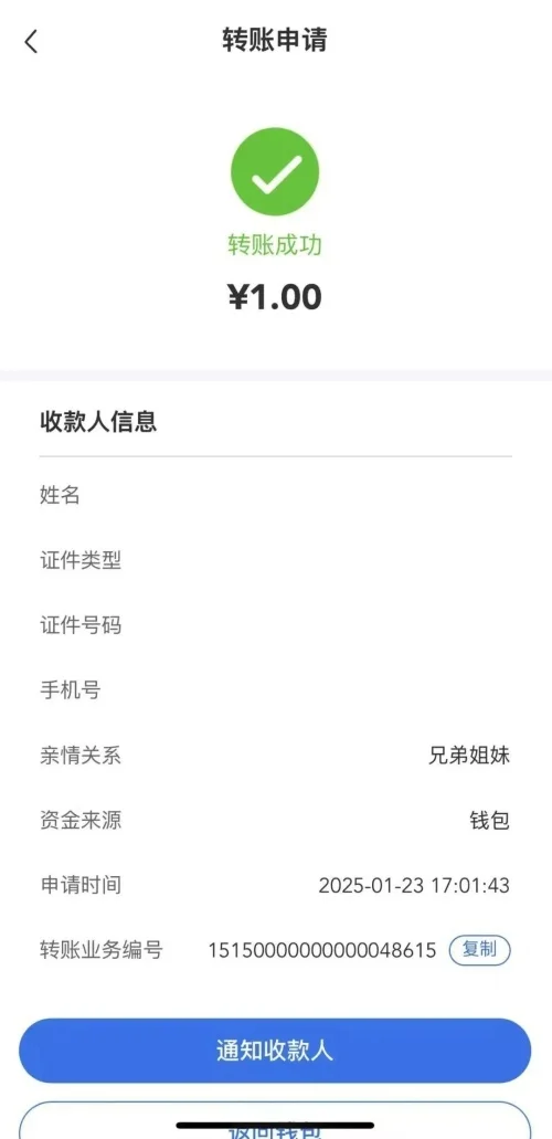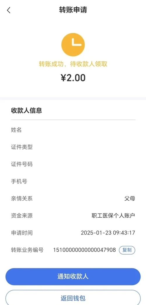 2、医保钱包转账时,若被转账医保钱包账户未开立,则如下图所示: