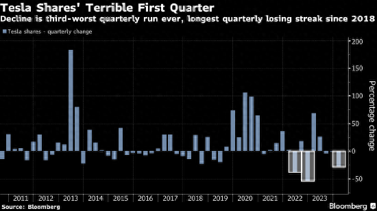即将结束的第一季度将是该股有史以来表现最差的三个季度之一。今年迄今为止,特斯拉在标普500指数成份股中按百分比计算跌幅最大。该股已经完全回吐了去年5月中旬以来的所有涨幅,自去年7月触及52周高点以来市值已蒸发逾3500亿美元。该股周四早盘又一度下跌2.3%。