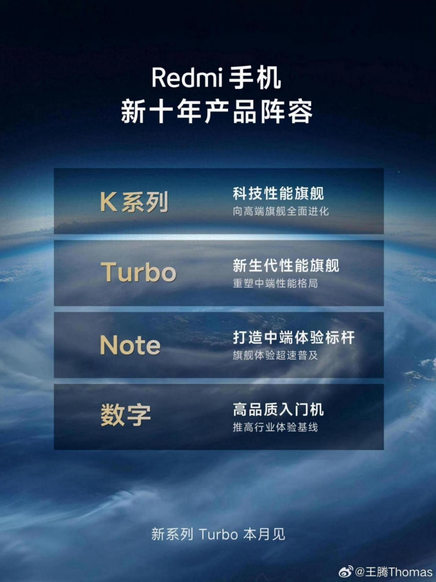 今日,redmi手机产品经理王腾在个人社交账号中公开了「redmi新十年产品阵容」,除了早前已有消息泄露的「turbo」系列之外,数字系列、note系列和k系列均有相应的调整。