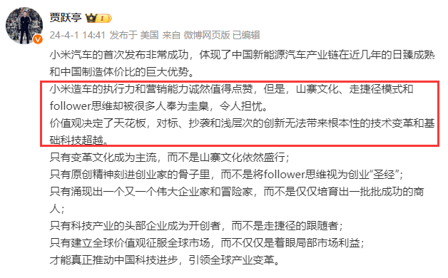 4月1日,faraday future创始人贾跃亭在其个人微博也发文为小米汽车的营销能力点赞。不过,贾跃亭在为小米造车的执行力和营销能力点赞的同时其还表示,山寨文化、走捷径模式和follower思维却被很多人奉为圭臬,令人担忧。