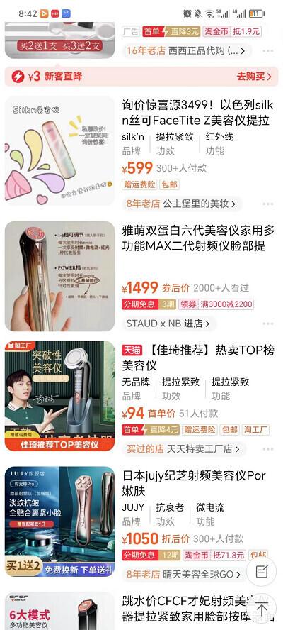 记者查询发现,花至、雅萌、觅光等品牌的京东旗舰店、天猫官方旗舰店均已下架射频美容仪产品,但相关平台的一些店铺仍旧在出售“射频美容仪”。