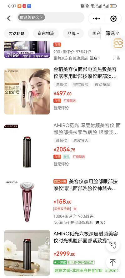在京东平台,京东自营的“觅光深层次射频美容仪”、京东之家北京王府井金宝店的“觅光六极深层射频美容仪”、京东之家龙旗广场店的“六极射频美容仪”和“济循大药房旗舰店”的“花至f100 pro升级款射频家用美容仪”等显示都可以购买。