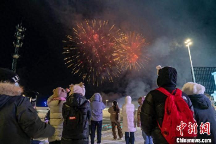 31日晚,哈尔滨冰雪大世界跨年烟花秀,吸引游客驻足观看 彭麒玮 摄