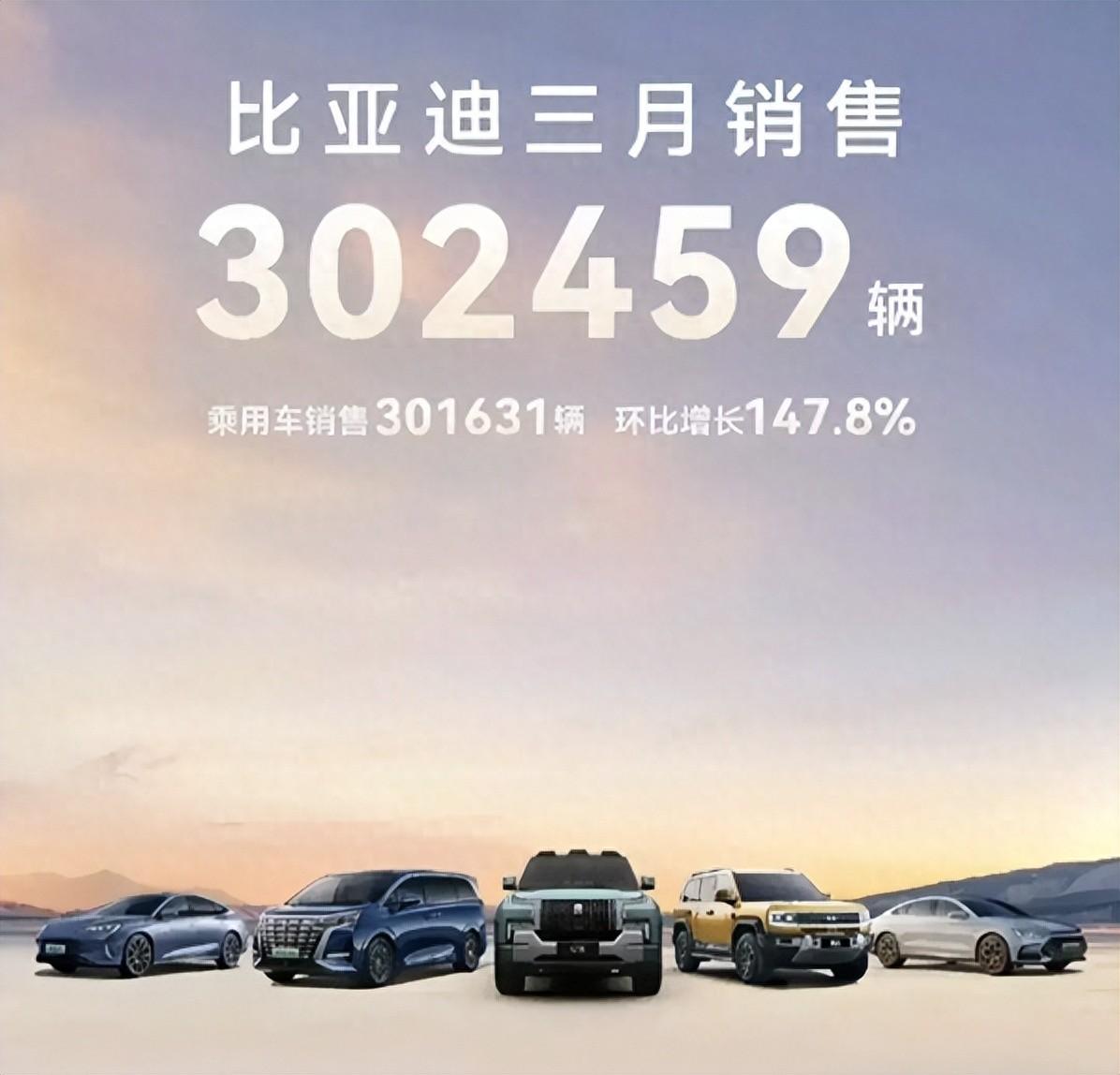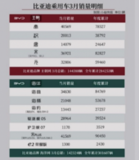 在出口方面,比亚迪3月乘用车出口量为38434辆。