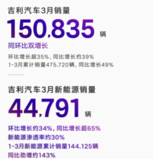 吉利3月份势头还不错。月销量超15万辆,同环比双增长均高于35%。其中新能源渗透率约30%,销量接近4.5万辆,主要依赖吉利银河系列、几何系列与极氪品牌的持续发力。走高端路线的极氪借小米舆论也涨了一波流量,3月交付了超1.3万台。