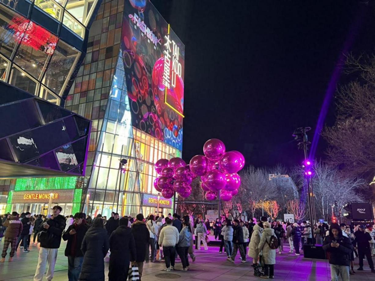跨年夜的三里屯商圈烟火气十足,多家首店、旗舰店的入驻为游客提供美食、娱乐休闲、购物等多元消费业态,路边璀璨的灯光也让节日氛围更加浓郁。