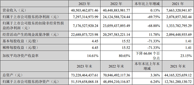 天齐锂业在2023财年内实现营业收入405.03亿元,虽然微增0.13%,但是归属母公司净利润却剧降至72.97亿元,跌幅高达69.75%。