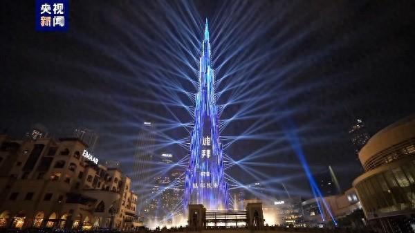 在现场观众的齐声倒计时中,哈利法塔的楼面led屏用阿拉伯语、英语和中文显示出“祝您新年快乐”的字样。当时间走进2024,大楼四周向外同时喷射出璀璨的烟花,点亮迪拜夜空。