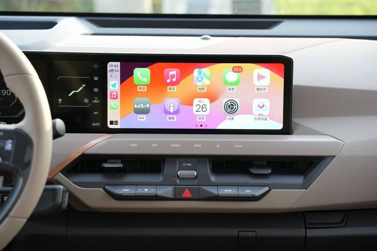 中控台部分,间27寸的一体式三联显示屏由是分为三部分,分别是12.3英寸的炫彩液晶仪表盘、12.3英寸的中央娱乐屏,以及中间5英寸的空调调节屏幕组成,一切都是好用的样子,而空调的物理按键被单独设置出来,操作更便捷。而中控屏幕的内容,显然是针对中国车主进行了优化,与百度和腾讯进行了深度合作,增加了30多款实用app,里面有车载微信、腾讯生态等,在新能源suv中比较出色。