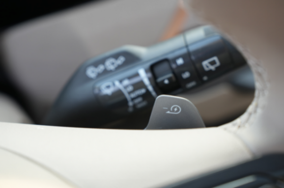 在方向盘下方是两个拨片,不过这并不是用来换挡的,而是用来手动调节动能回收力度的,从无感到单踏板模式共五档,根据车主个人喜好调整,同时动能回收也可以根据车主驾驶习惯自动调整。方向盘下方还有个驾驶模式按钮,可以在四种驾驶模式中切换,一切都是本着便利好用为原则。